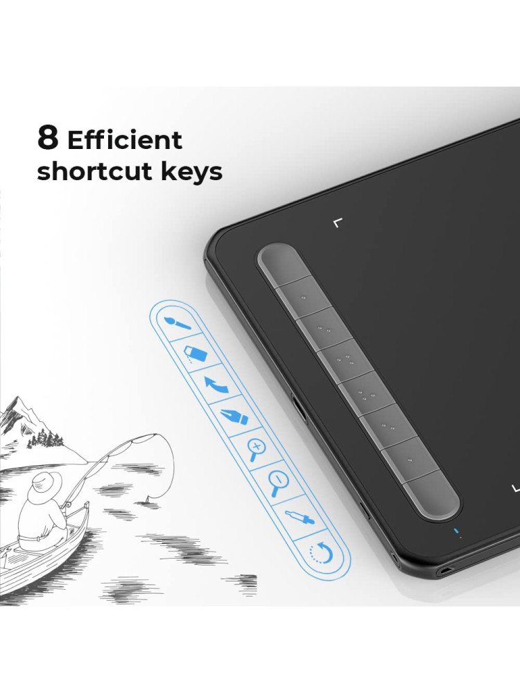 • [8 Özelleştirilmiş Kısayol Tuşu] Deco M Çizim Tableti, ihtiyaç duyulan çeşitli kısayol kombinasyonlarına uyacak şekilde özelleştirilebilen ve böylece bir bilgisayar klavyesinin yerini alan sekiz kısayol tuşuna sahiptir. Tuşlardaki çeşitli dokunsal tümsekler, loş bir ortamda bile doğru kısayolu hızlı bir şekilde belirlemenizi sağlayarak iş akışınızı hızlandırmanıza yardımcı olur.