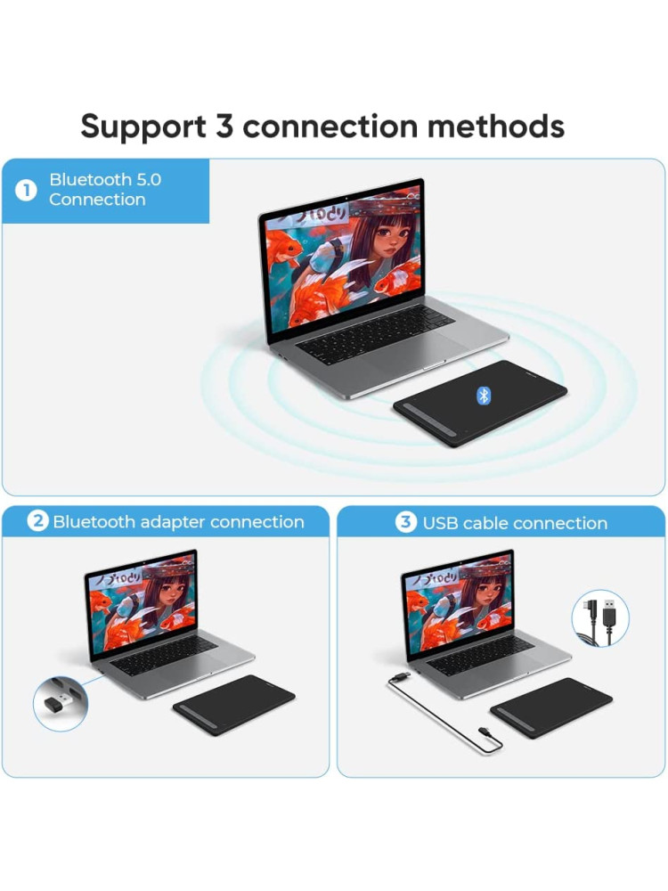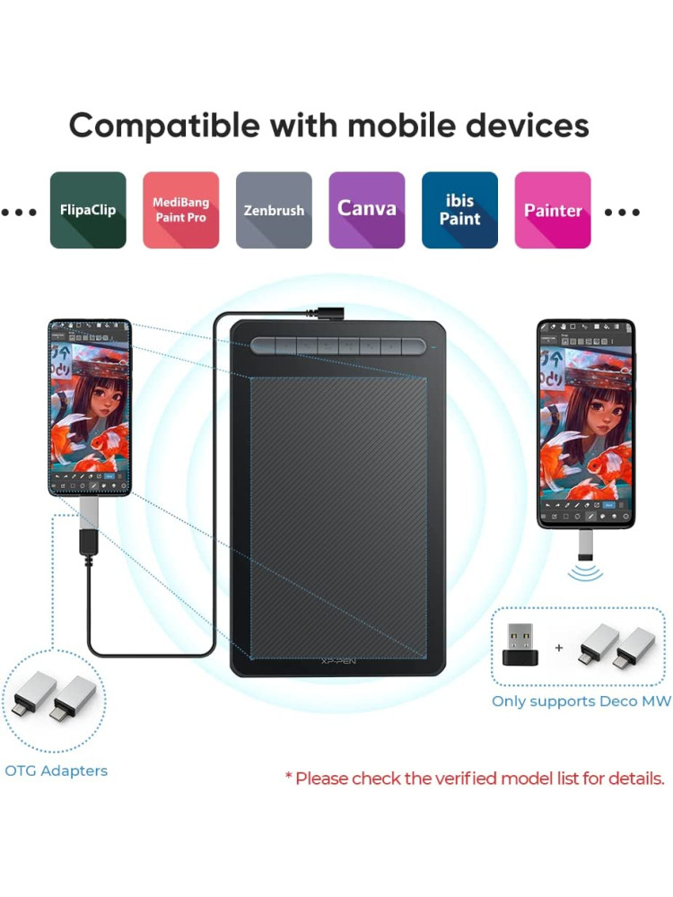 Bir Bluetooth v5.0 yongası ile donatılmış olan Deco MW çizim tableti, kablo sınırlaması olmaksızın yaratıcılığınızı düzenli tutmanıza olanak tanıyarak ve ilhamınızın sizi götürdüğü her yerde cihazınızı kullanabilmeniz için size taşınabilirlik sağlayarak sizi özgür bırakır.