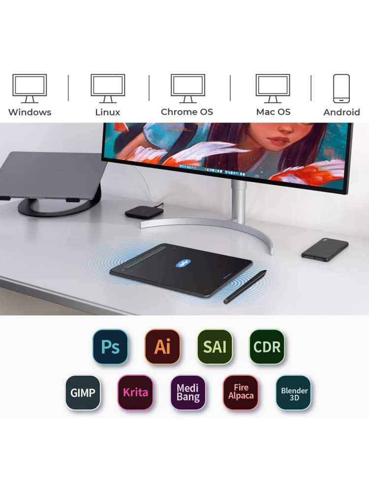 • [Mükemmel Uyumluluk] Deco M, Windows 7 (veya üstü), Mac OS X 10.10 (veya üstü), Android 6.0 (veya üstü), Chrome OS 88 (veya üstü) ve Linux sistemleriyle uyumludur. Deco M, Photoshop, Illustrator, SAI, GIMP, Krita, MediBang Paint, FireAlpaca, Blender ve daha fazlası dahil olmak üzere çoğu büyük sanat yazılımıyla çalışabilir. Kalemli tabletin kapsamlı uyumluluğu, yaratıcı ufkunuzu genişletir.