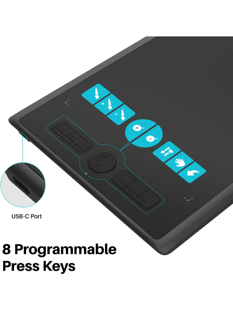 8 Özelleştirilmiş Tuş Tuşu - 8 adet programlanabilir tuş ile en sık kullandığınız işlevlere tek bir dokunuşla erişebilir ve daha yüksek verimlilikle çalışabilirsiniz. Ergonomik tasarım-dar çerçeve avuç içi alanı ve yuvarlatılmış köşeler, uzun çalışma saatlerinden sonra elin yorgunluğunu azaltabilir. Ayrıca sürücüdeki alışkanlıklarınıza uyması için kalemli tableti 90°, 180° veya 270° döndürebilirsiniz.
